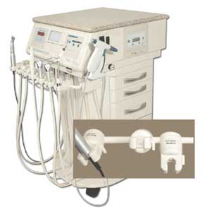ASI’s new holder, a standard feature on Designer Series delivery systems, features a robust twelve-sided bar design to retain and locate handpieces securely. A ball plunger actuator, replacing old flipper switch designs, delivers precise activation. Individual lockout mechanisms for each handpiece provide safety and convenience when changing tips or files. A new articulation feature allows both vertical and side-to-side positioning for improved handpiece access. Adjustable handpiece spacing is provided in the design.