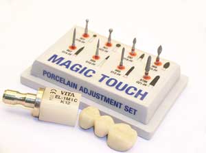 Strauss has added a new porcelain adjustment kit to its lineup, called the Magic Touch. This unique kit features eight different shapes, selected by dentists to satisfy the most common adjustment needs.  The kit contains diamonds with a special new grit which allows fast adjustment similar to a coarse grit, but without risk of chipping the porcelain, and leaves a very fine finish without scratches.  The Magic Touch kit has demonstrated excellent results on all types of PFM, ceramic and zirconia crowns and bridges, including the Procad ® and Vita ® ceramic crowns, as well as Lava crowns and bridges.  For the first time, dentists are able to trim porcelain as easily as composite.  The kit features the following burs:  801/018PF, 801/022PF, 390/018PF, 368/023PF, 862/014PF, 889/010PF, 855/012PF and 878K/021PF.  To obtain optimal results, Strauss suggests working with these burs using a light touch, due to their extreme cutting efficiency on porcelain and all hard ceramics.