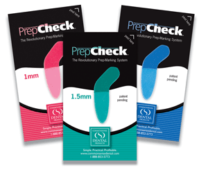 PrepCheck tabs come in in 3 sizes: 1mm for gold crown, 1.5 mm for porcelain to metal, and 2mm for non-metal.