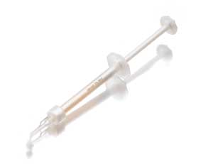2. Grasp syringes with both hands between index and middle finger. To mix, push material from white syringe to the clear syringe and back 5 times. Push varnish into white syringe for delivery. This remixes the content and ensures full suspension of the ingredients. Twist on the FX Flex tip tightly. The tip may be bent up to a 90 degree angle for convenience of application. (Product will not flow freely if tip is bent too much)