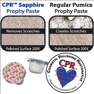 CPR™ Sapphire Prophy Paste now has a smoother, splatter resistant formula. To replace rough pumice & expensive composite pastes, CPR™ is safe for routine maintenance of veneers, restores brilliance to dull crowns, removes up to 4 shades of stain from composites, & cleans & polishes natural teeth & all other surfaces as quickly as coarse pumice, with less abrasivity than some daily use toothpastes. 1 micron uniform Sapphire spherical composition makes CPR™ perfect for non-abrasive routine mixed mouth prophylaxis, & as a final step after placement & adjustments & to maintain all cosmetic restorations. Routine polishing with CPR™ creates super smooth surfaces, making it difficult for adhesion of biofilm, which minimizes stain & caries.