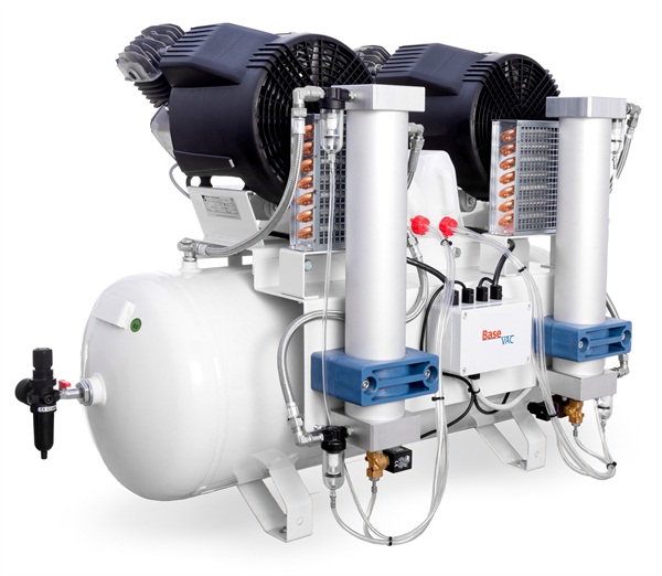Base Vac medical and dental compressors feature a heavy-duty block, durable cast cylinders, forged steel connecting rods, and precision-machined pistons with niploid-plated steel sleeves. Compressors feature a 100% oil-free design and the patented Perma Dry self- purging desiccant, providing the dental operatory with high-quality, oil-free air.