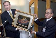 PHOTO: Osaka Dental University President Dr. Hisao Imai presents a gift to Dr. Ira Lamster, dean of Columbia University School of Dental and Oral Surgery.