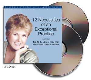 CareCredit® is offering free to practices, a new educational audio CD titled, “12 Necessities of An Exceptional Practice,” featuring Linda Miles, CSP, CMC. Linda Miles is the CEO of Linda L. Miles and Associates and founder of SCN, the Speaking-Consulting Network. She is a popular speaker and author and as a consultant has personally worked with hundreds of dental teams nationwide to help them achieve their professional goals.